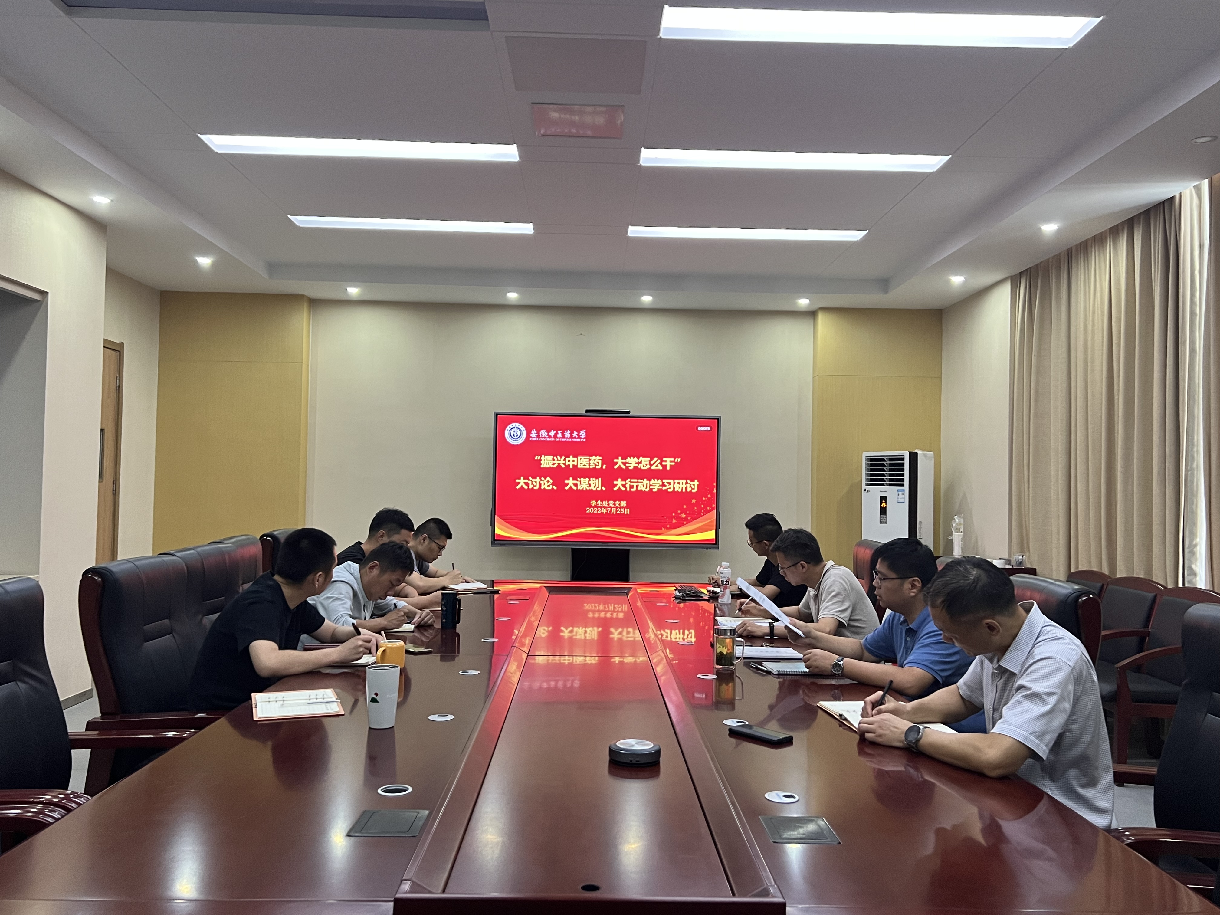 为贯彻落实学校党委书记王琦在学校“‘振兴中医药,大学怎么干’大讨论、大谋划、大行动”动员部署会上的讲话精神及学校党委的有关工作部署,7月25日上午,学生处党支部在少荃湖校区惟是楼383会议室召开专题学习研讨会。会议由学生处党支部书记张军主持。