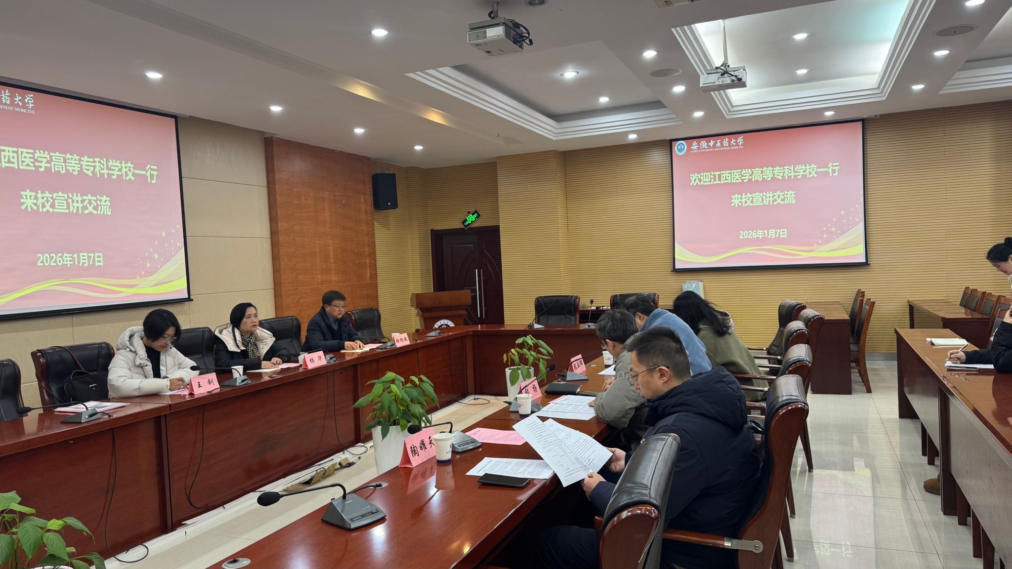 1月7日上午,江西医学高等专科学校2026年人才招聘座谈会在我校新安楼会议室举行。江西医学高等专科学校党委委员、副校长杨华一行来校开展人才宣讲交流。中医学院、第一临床医学院、药学院及学生处相关负责人参加会议。会议由学生处副处长张扬主持。