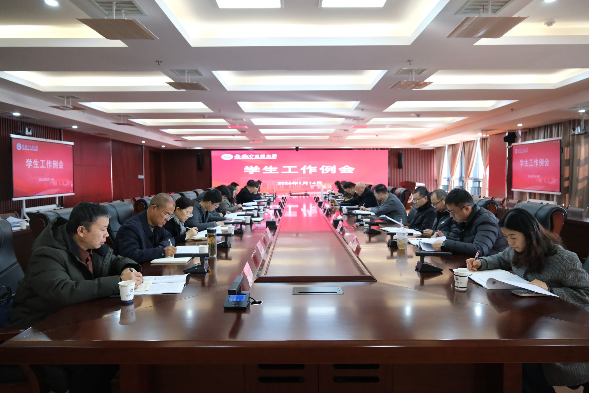 1月14日上午,学校召开2025年秋季学期期末学生工作例会。校党委副书记周新发出席会议并讲话,相关职能部门负责人、各学院分管学生工作领导参加会议。