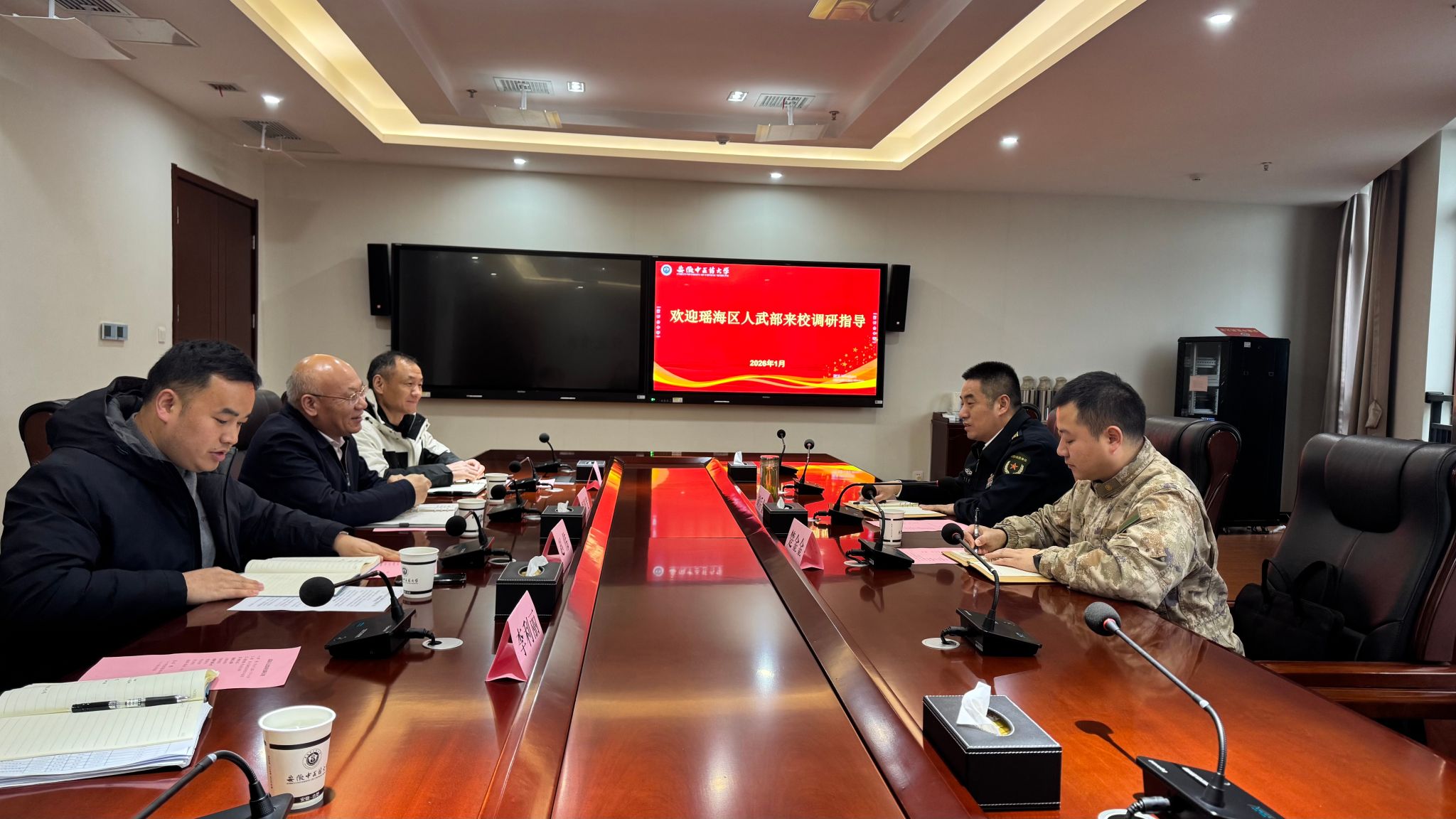 1月26日下午,瑶海区人武部政治委员胡后金上校一行来校开展大学生征兵及国防教育工作专题调研。校党委副书记周新发出席会议,学生处、保卫处、就业科(征兵办)等部门负责人参加座谈。
