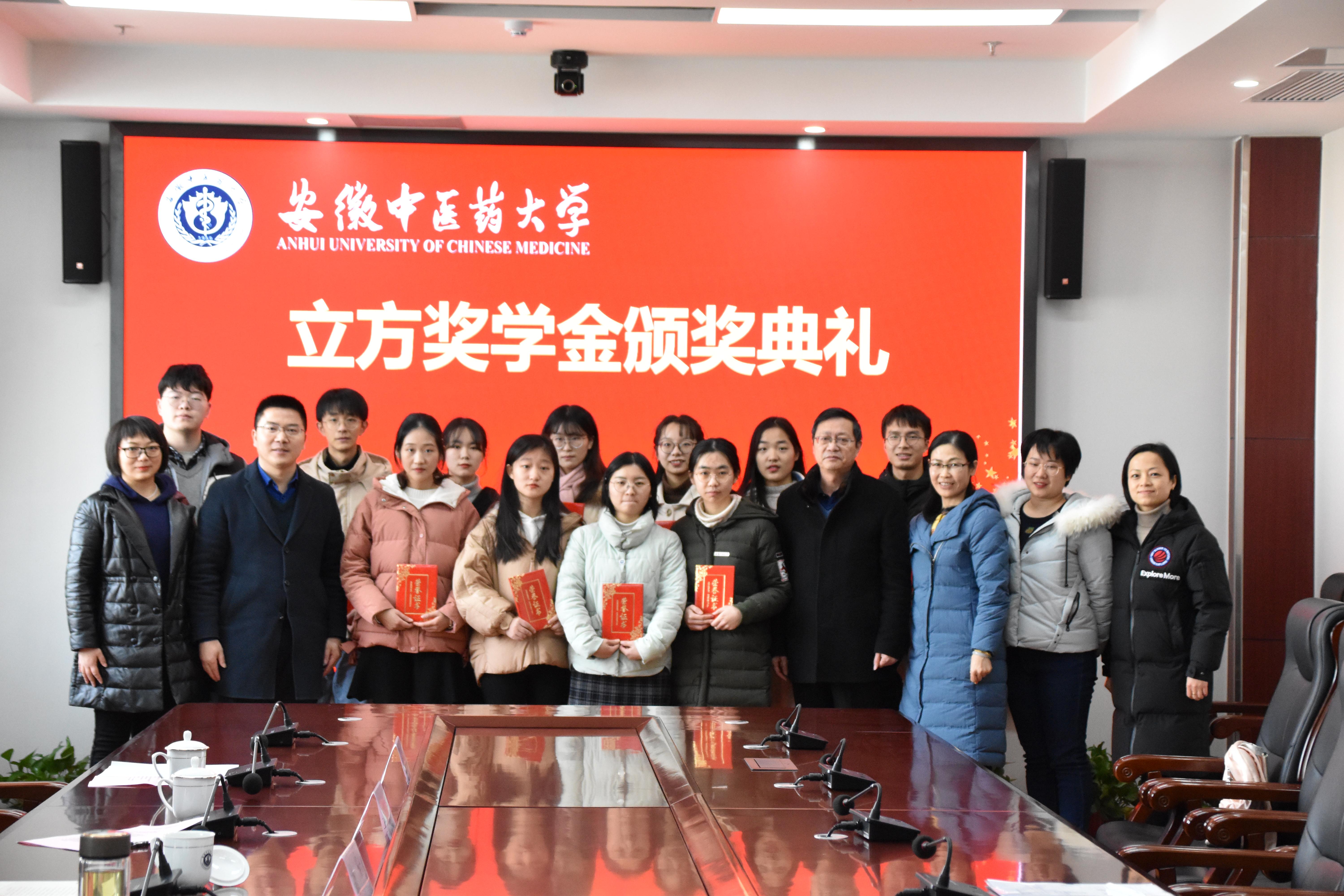 1月7日上午,安徽中医药大学教育发展基金会立方奖学金颁奖仪式在少荃湖校区图书馆708会议室举行,学校党委副书记张永群,合肥立方制药股份有限公司副总经理夏军、人力资源部部长王彩英、人力资源专员田红雨,学校学生处处长王红松、副处长金晓琴、立方奖学金20名获奖学生代表等参加活动。颁奖仪式由学生处处长王红松主持。
