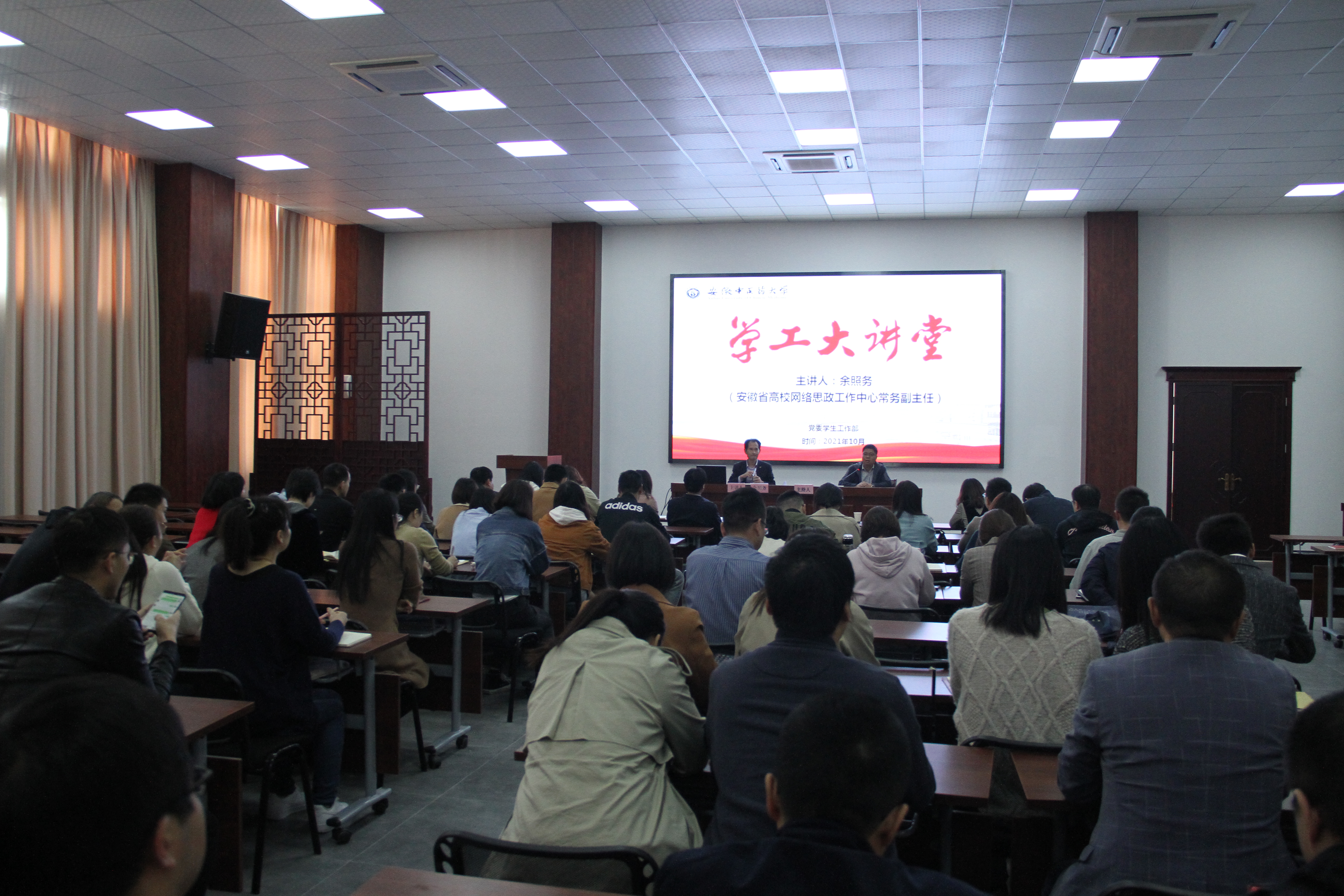 为进一步推进我校智慧思政工作开展,10月29日下午,党委学生工作部邀请到安徽省高校网络思政工作中心常务副主任余照务作客我校“学工大讲堂”,举办“构建智慧思政大平台筑牢铸魂育人新高地”专题讲座。讲座由学工部部长张军主持。