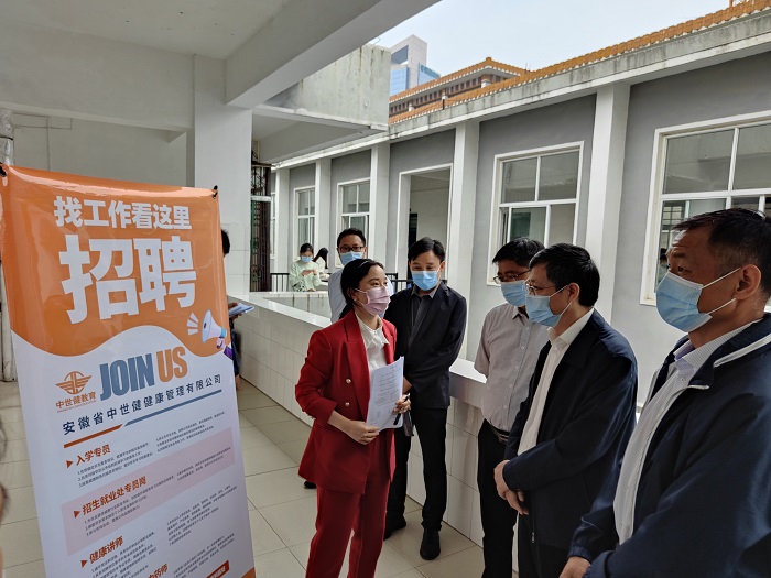 5月12日上午,安徽中医药大学2022年“就业促进周”校园小型专场招聘会在梅山路校区顺利举办,学校党委副书记张永群在招聘会现场走访用人单位并看望毕业生,学校相关部门及学院主要负责人、分管副书记、就业工作秘书、2022届毕业班辅导员等参会。