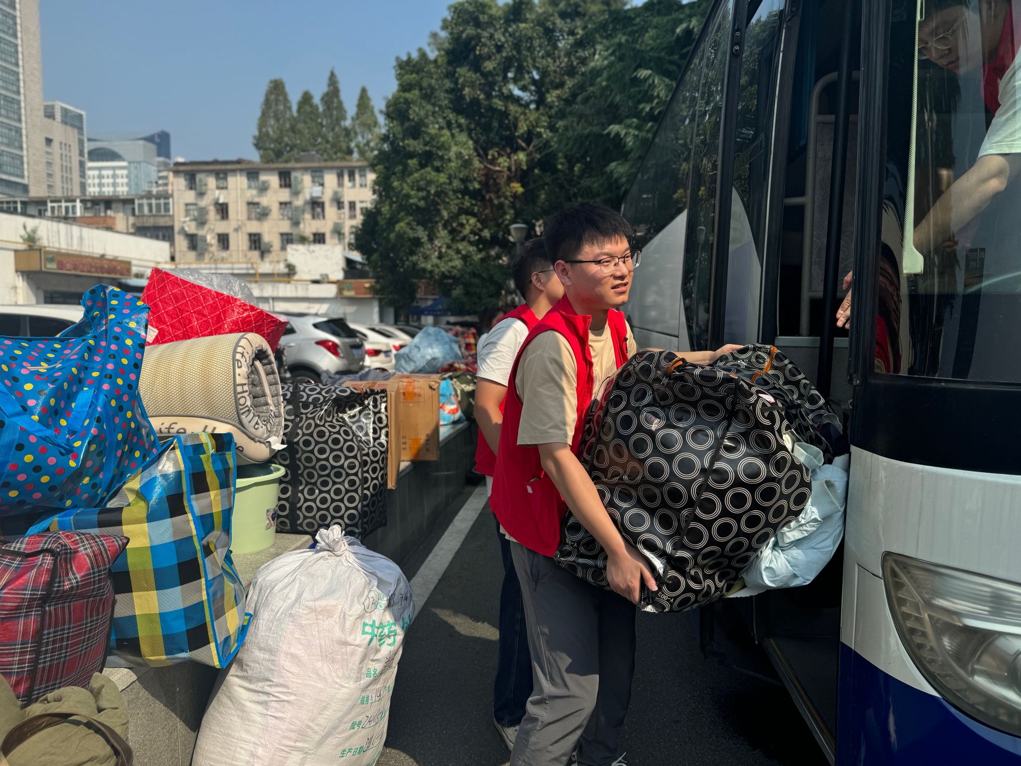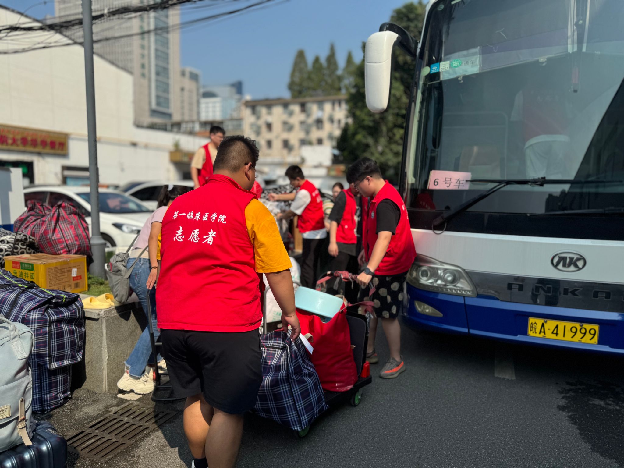 为确保搬迁工作安全平稳,学校为同学们准备了小推车、行李袋、胶带、姓名贴、饮用水等搬迁物资,租赁了8辆客车接送搬迁同学。第一临床医学院组织了由党员、入党积极分子、学生干部等组成的互助志愿活动,同学们克服炎热天气带来的不良影响,积极主动参与到搬迁工作中,齐心协力共同打造一个温馨、有序的搬迁环境。
