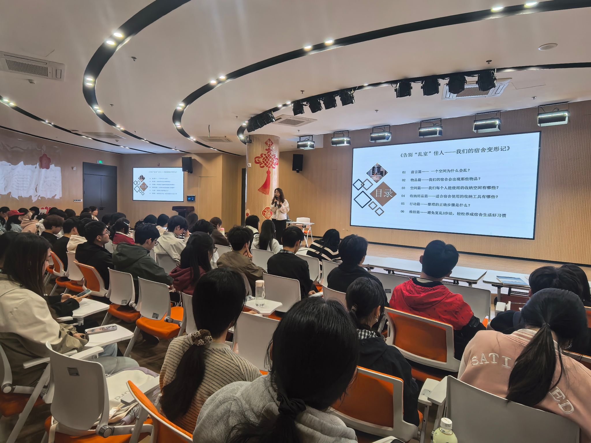 为提升学生自我管理能力,营造整洁宿舍环境,4月14日晚,学生处(学工部、研工部)在大学生“一站式”岐黄社区举办宿舍收纳专题讲座,特邀专业收纳整理师主讲,120余名学生到场参与。